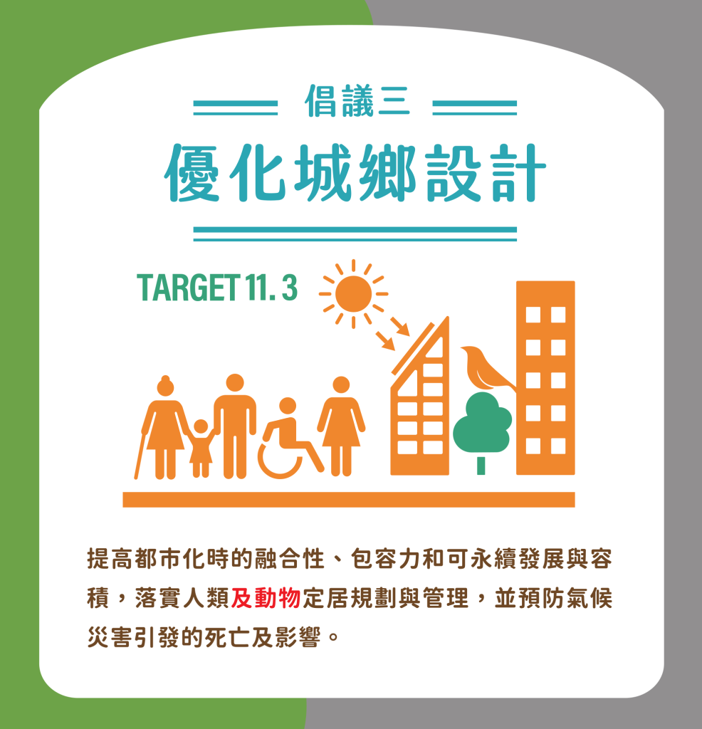 SDG11:永續城鄉的細項「11.3 – 包容性永續城市化」 提到在西元2030年前,提高都市化時的融合性、包容力和可永續發展與容積,落實人類及動物定居規劃與管理,並預防氣候災害引發的死亡及影響。