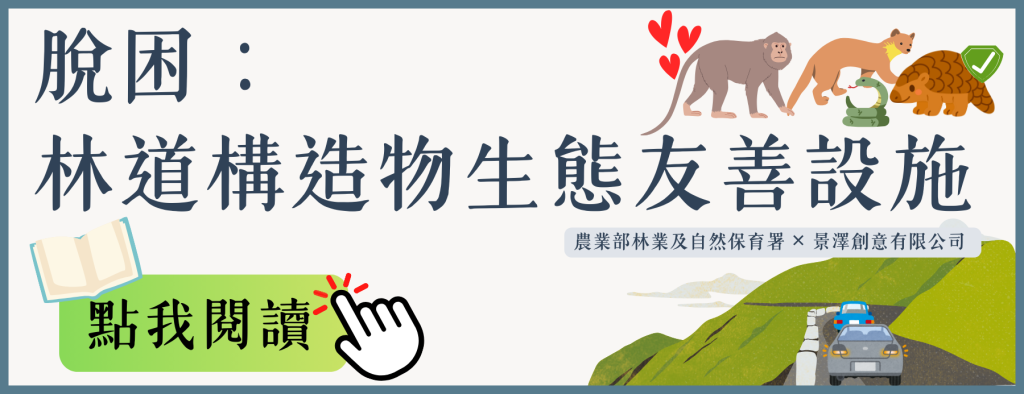 👇👇點擊農業部林業及自然保育署景澤創意有限公司《脫困:林道構造物生態友善設施》手冊,看看這些富巧思的設計,如何在兼顧山區道路安全的同時,也幫助野生動物安全、順利的通行吧!👇👇