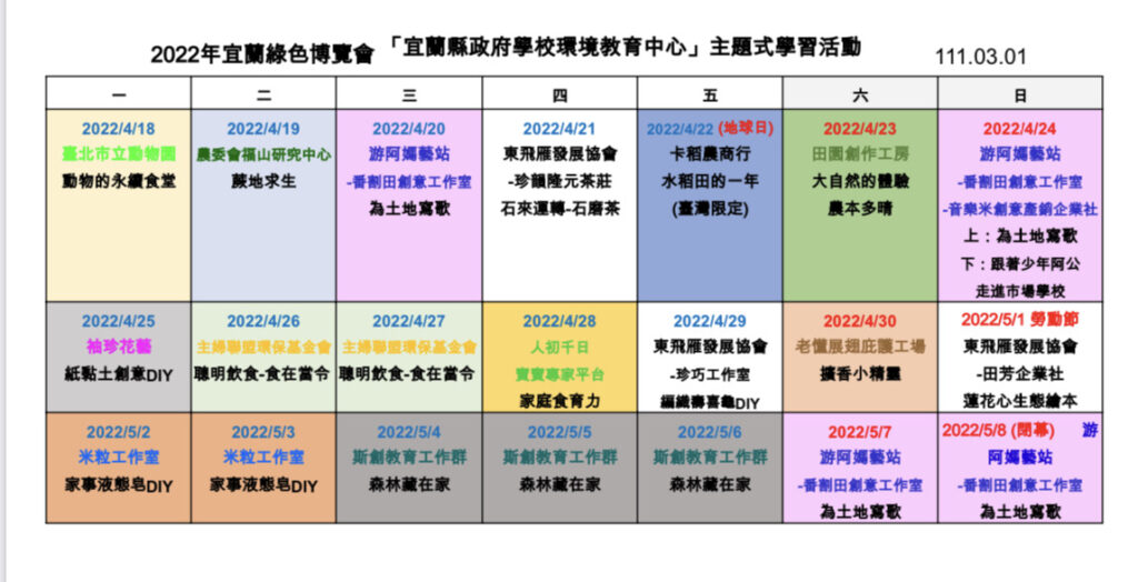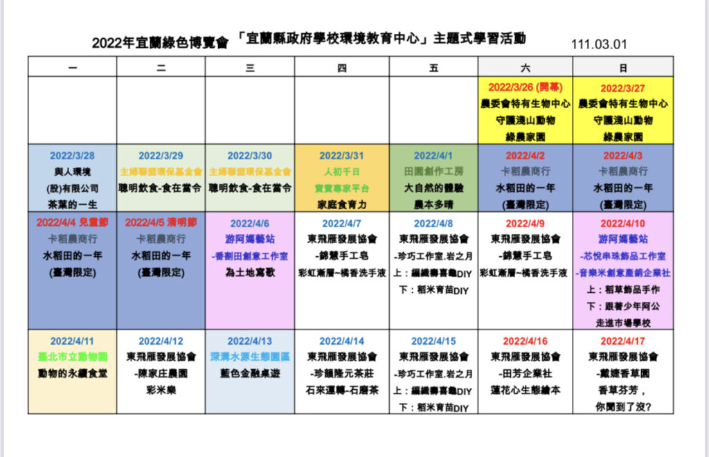 配合本次綠色博覽會主題,邀請縣內外環境教育場域相關團體共同辦理系列課程,提供現場DIY體驗、互動活動,並透過活動內容呈現各單位之特色內涵,歡迎大小朋友一起來體驗精采有趣的活動。