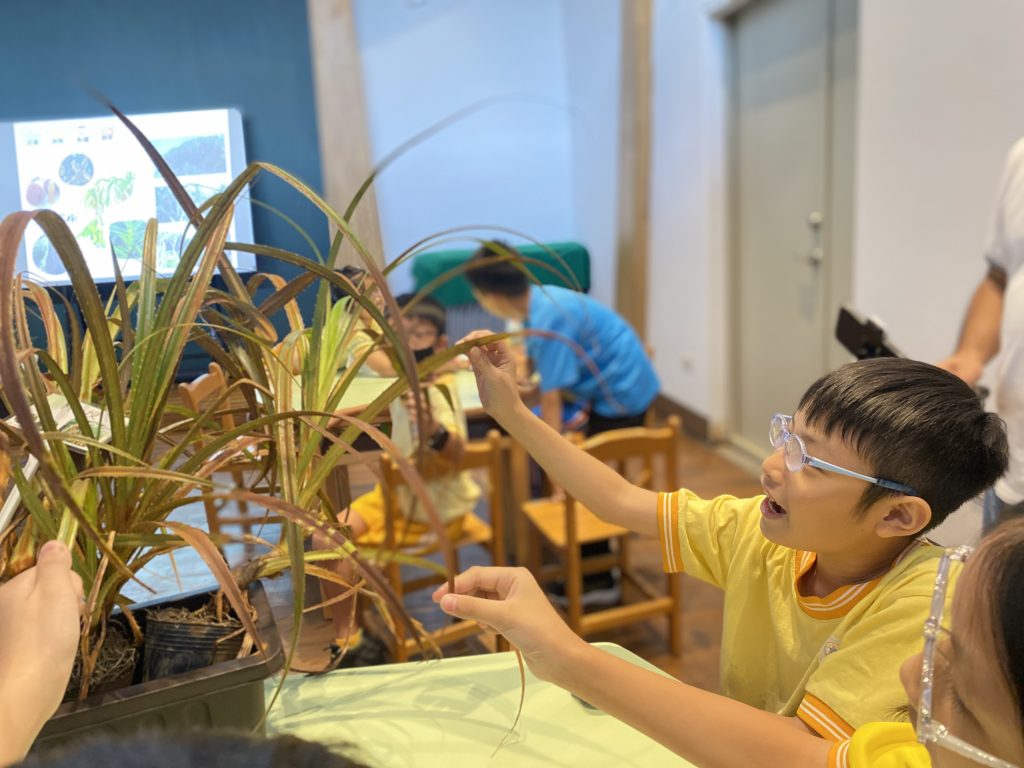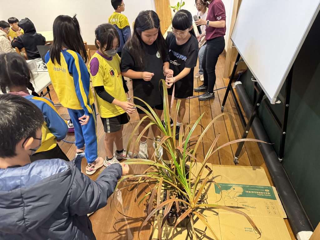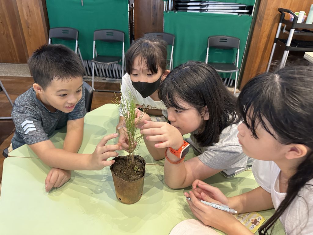 透過現場帶來的沿海「飛砂防止保安林」樹種盆栽,小朋友們近距離觀察它們的特殊構造與超能力,感受植物在風沙中挺立的韌性。