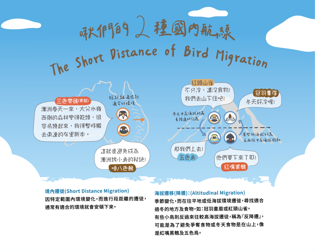 B-1-3 啾們的 2 種國內航線啾們的 2 種國內航線境內遷徙(Short Distance Migration):因特定範圍內環境變化,而進行段距離的遷徒,通常有適合的環境就會安頓下來。 海拔遷移(降遷)(Altitudinal Migration) :季節變化,而在往平地或低海拔環境遷徙,尋找適合過冬的地方及食物,如:冠羽畫眉或紅頭山雀。 有些小鳥則反過來往較高海拔遷徒,稱為『反降遷』,可能是為了避免爭奪食物或冬天食物是在山上,像是紅嘴黑鵯及五色鳥。回到展覽首頁環教瘋學習-候鳥起飛