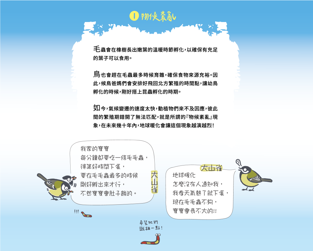 如今,氣候變遷的速度太快,動植物們來不及因應,彼此間的繁殖期錯開了無法匹配,就是所謂的『物候紊亂』現象,在未來幾十年內,地球暖化會讓這個現象越演越烈!