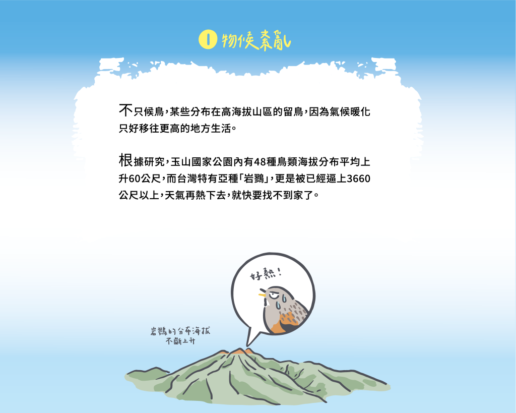 根據研究,玉山國家公園內有48種鳥類海拔分布平均上升60公尺,而台灣特有亞種「岩鷚」,更是被已經逼上3660公尺以上,天氣再熱下去,就快要找不到家了。