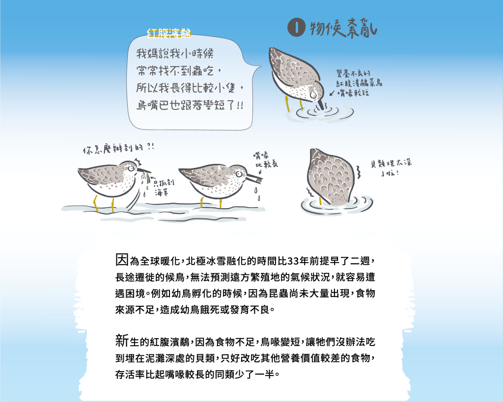 因為全球暖化,北極冰雪融化的時間比33年前提早了二週,長途遷徙的候鳥,無法預測遠方繁殖地的氣候狀況,就容易遭遇到困境。導致幼鳥孵化的時候,昆蟲尚未大量出現,因為食物來源不充足,造成幼鳥餓死或發育不良。