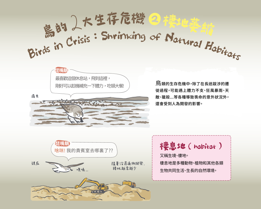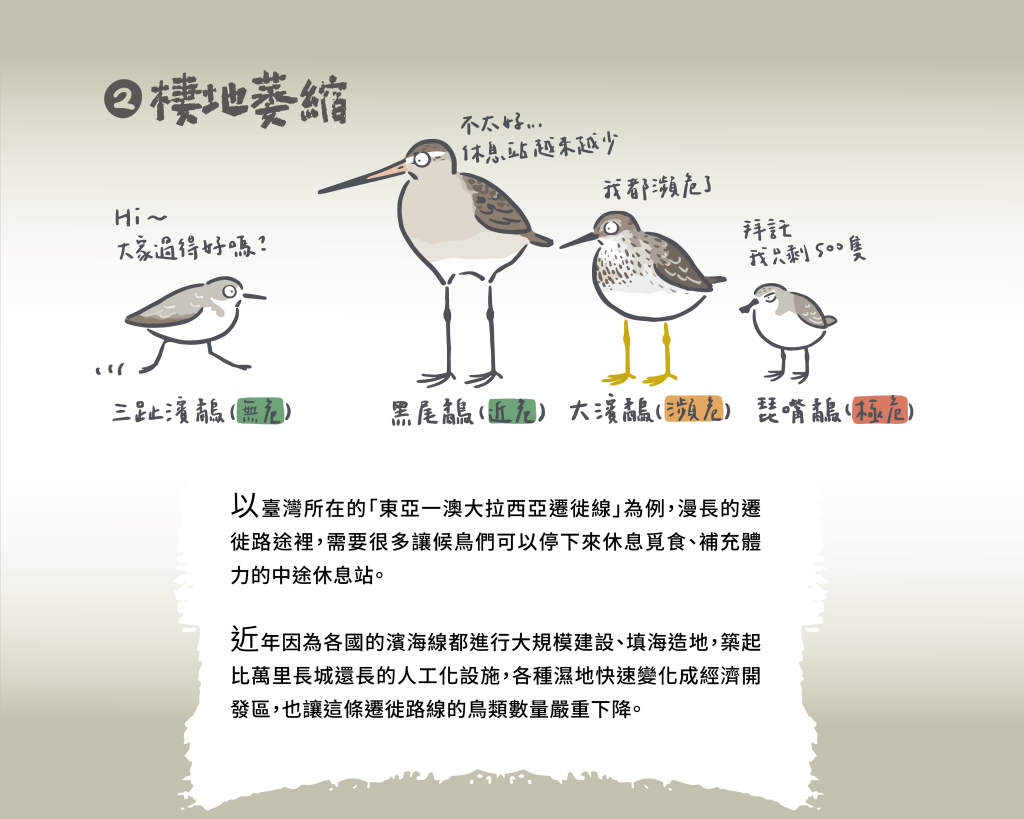 B-3 鳥的生存危機-棲地萎縮生存危機之棲地萎縮鳥類的生存危機中,除了在長途跋涉的遷徙過程,可能遇上體力不支、狂風暴雨、天敵、獵殺…等各種導致喪命的意外狀況,還要再加上人為開發的影響。棲息地(habitat)又稱生境、棲地。多種動物、植物其它各類生物共同生活和生長的自然環境。以臺灣所在的「東亞一澳大拉西亞遷徙線」為例,漫長的遷徙路途裡,需要很多讓候鳥們可以停下來休息覓食、補充體力的中途休息站。近年因為各國的濱海線都進行大規模建設、填海造地,築起比萬里長城還長的人工化設施,各種濕地快速流變成經濟開發區,也讓這條遷徙路線的鳥類数量嚴重下降。回到展覽首頁環教瘋學習-候鳥起飛