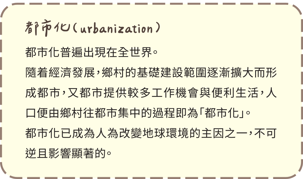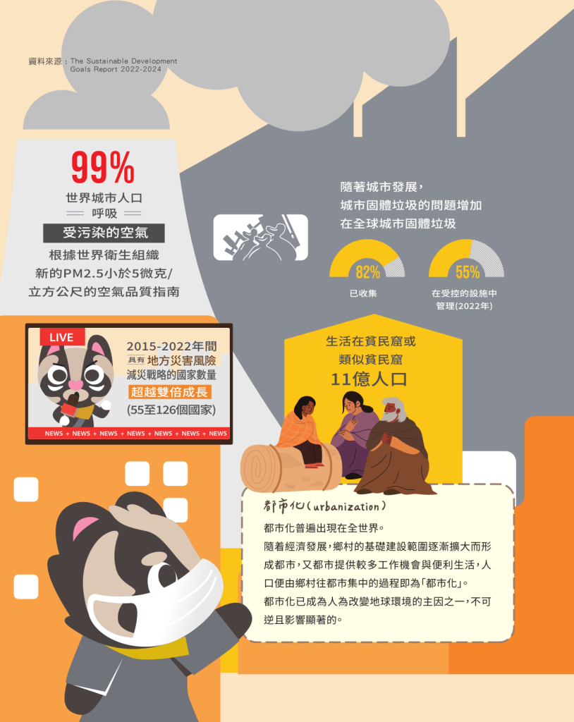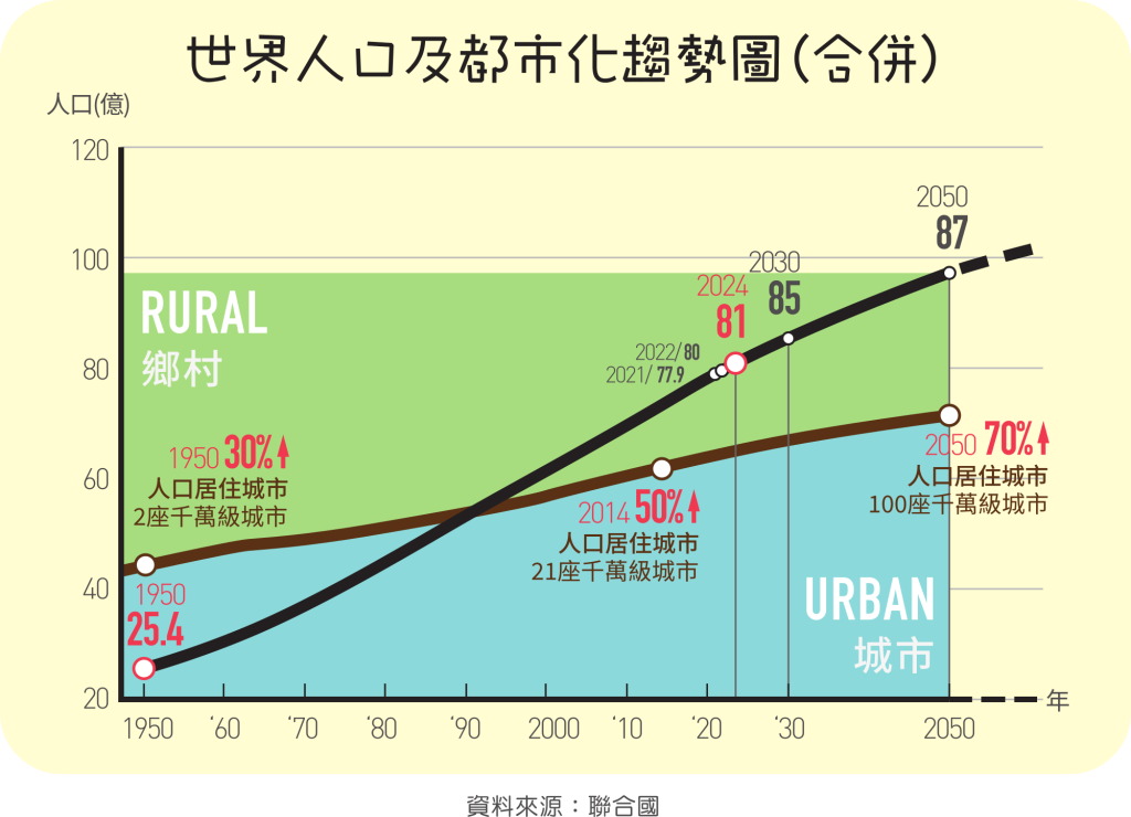 2022年11月,世界人口達到80億,其中一半以上(55%)居住在城市地區,預計到2050年這一數字將上升至70%。快速都市化的現象也同樣出現在臺灣,臺灣都市人口比例在1980年僅有48.7%,而目前已超過80%。